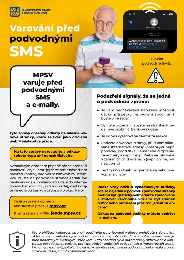 VAROVÁNÍ PŘED PODVODNÝMI SMS 1 Ministerstvo práce a sociálních věcí varuje před podvodnými SMS a e-maily.