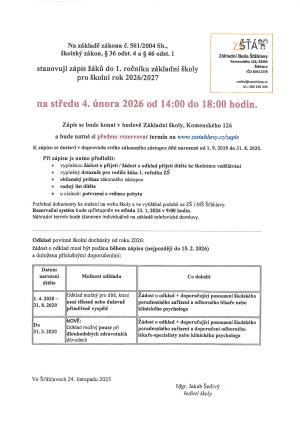 Zápis se bude konat 4. 2. 2026 od 14:00 do 18:00 hod.